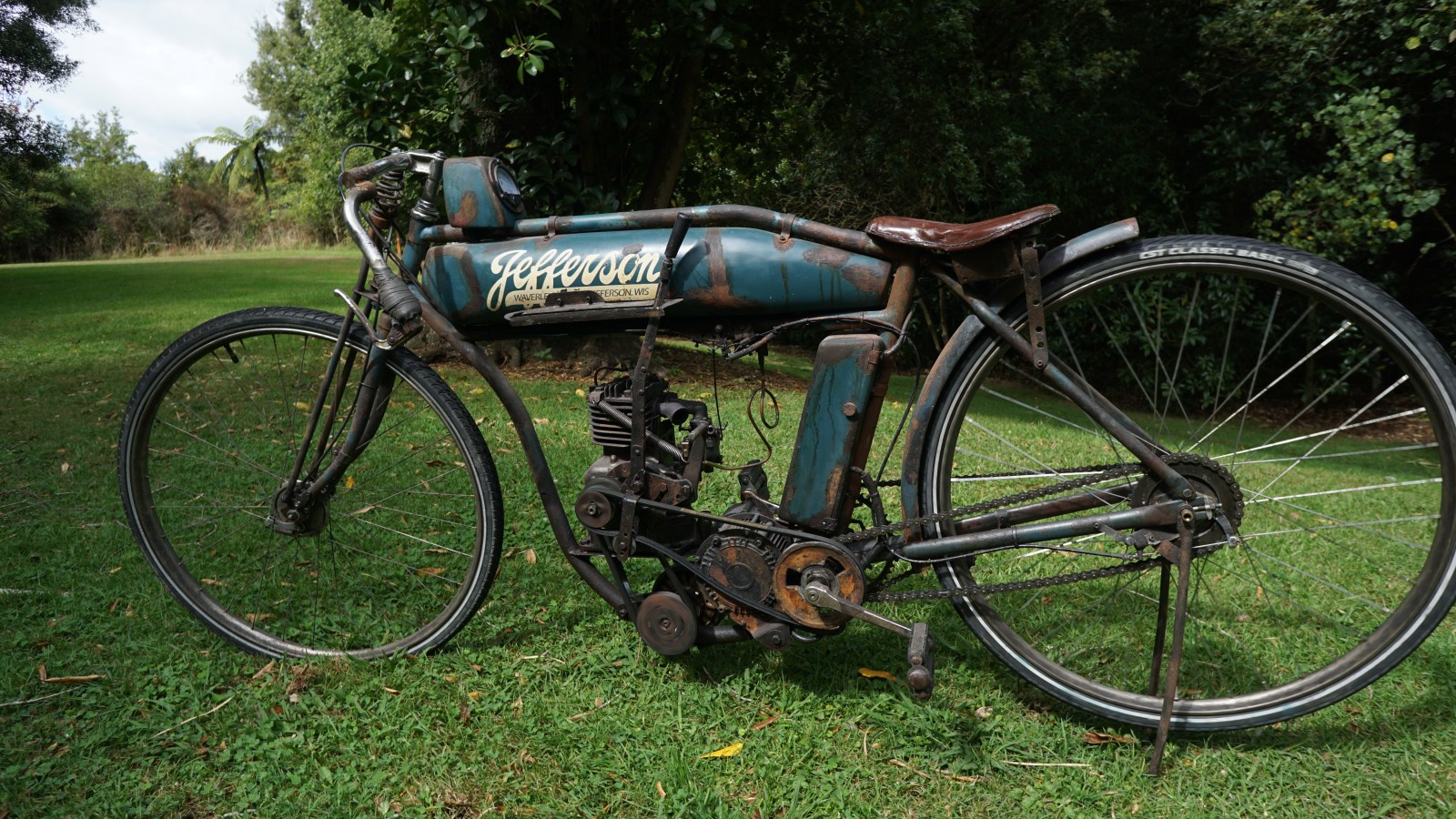 This is my hybrid bicycle – electric and petrol powered – a retro build with the “petrol tank” hold a 50 volt battery as well as a litre of petrol for the 1940-‘s B & S motor. It is modeled on the board track racers of the 1920’s. The rust look is a type of “rust” paint that reproduces real rust – not just the appearance. Clever eh!