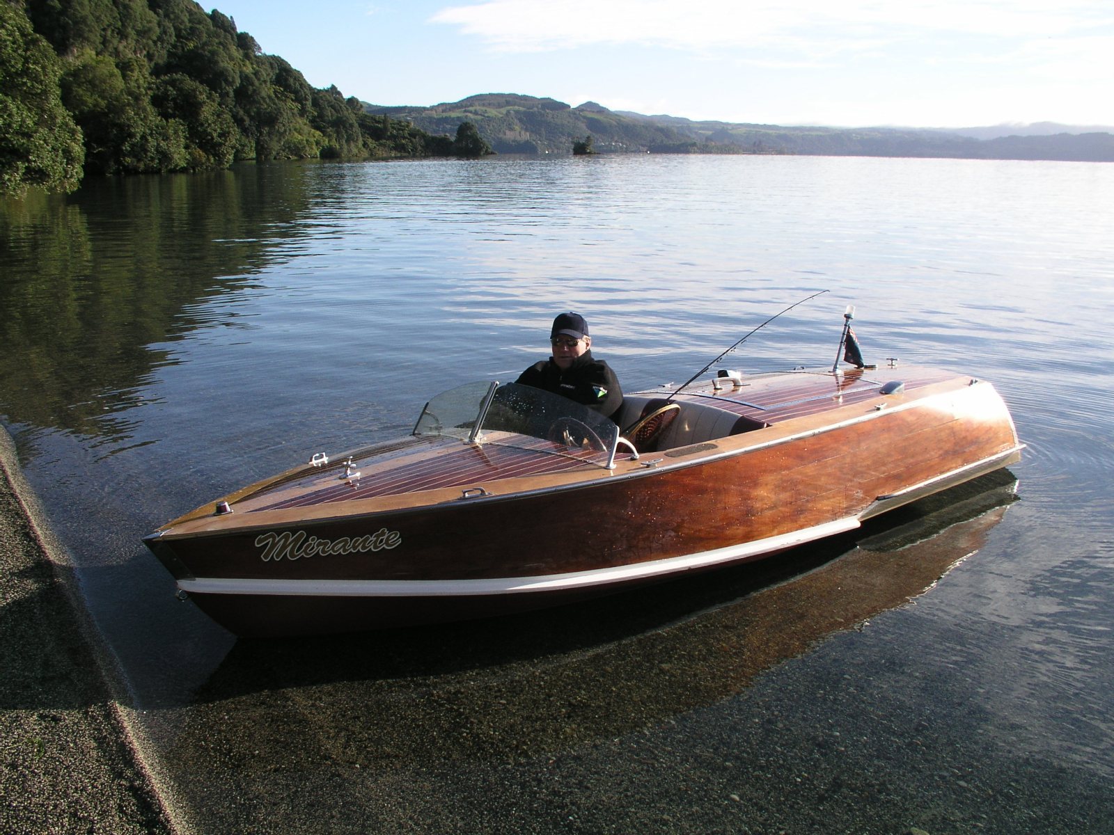 Mirante – a 15 ft mahogany runabout build over two years from 1998 . It is mahogany veneer over a ply hull and is powered by a marinised converted 1800cc Subaru OHC (EA82) motor.