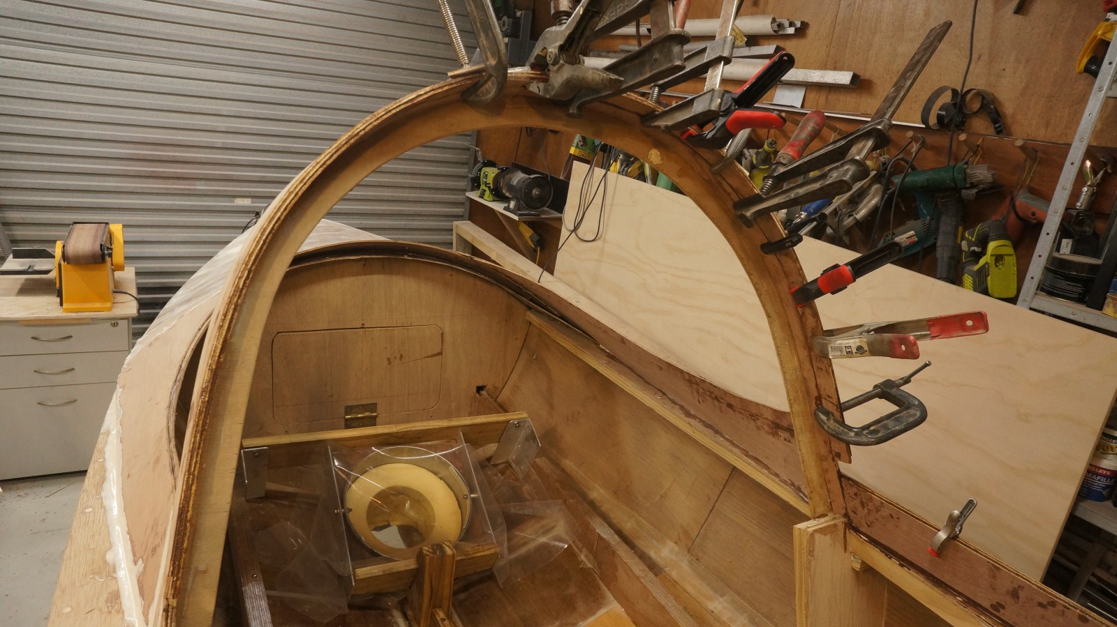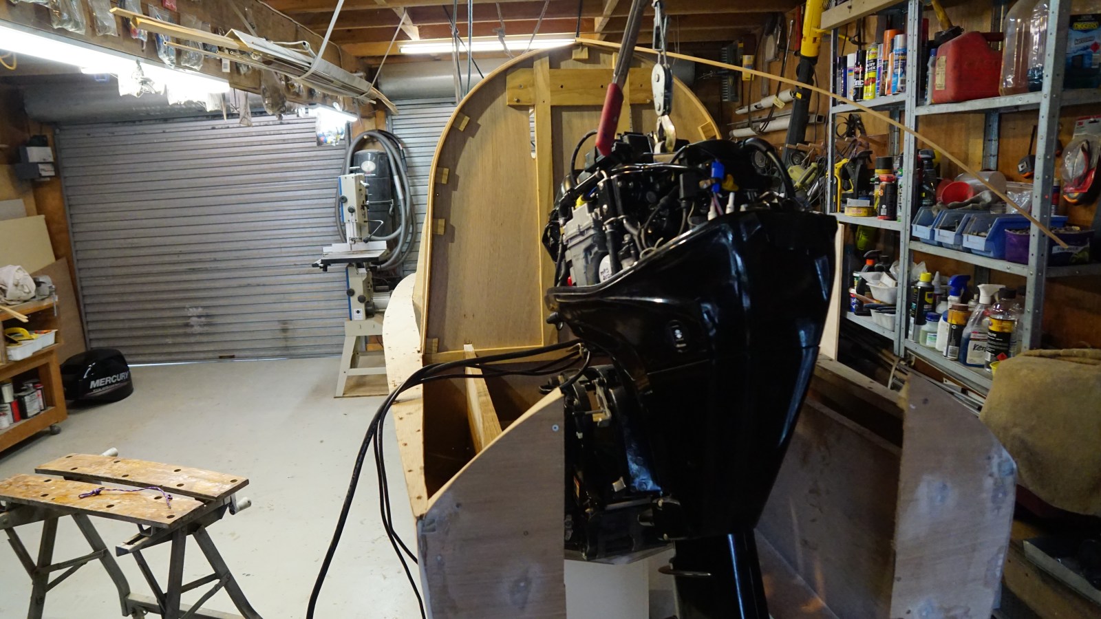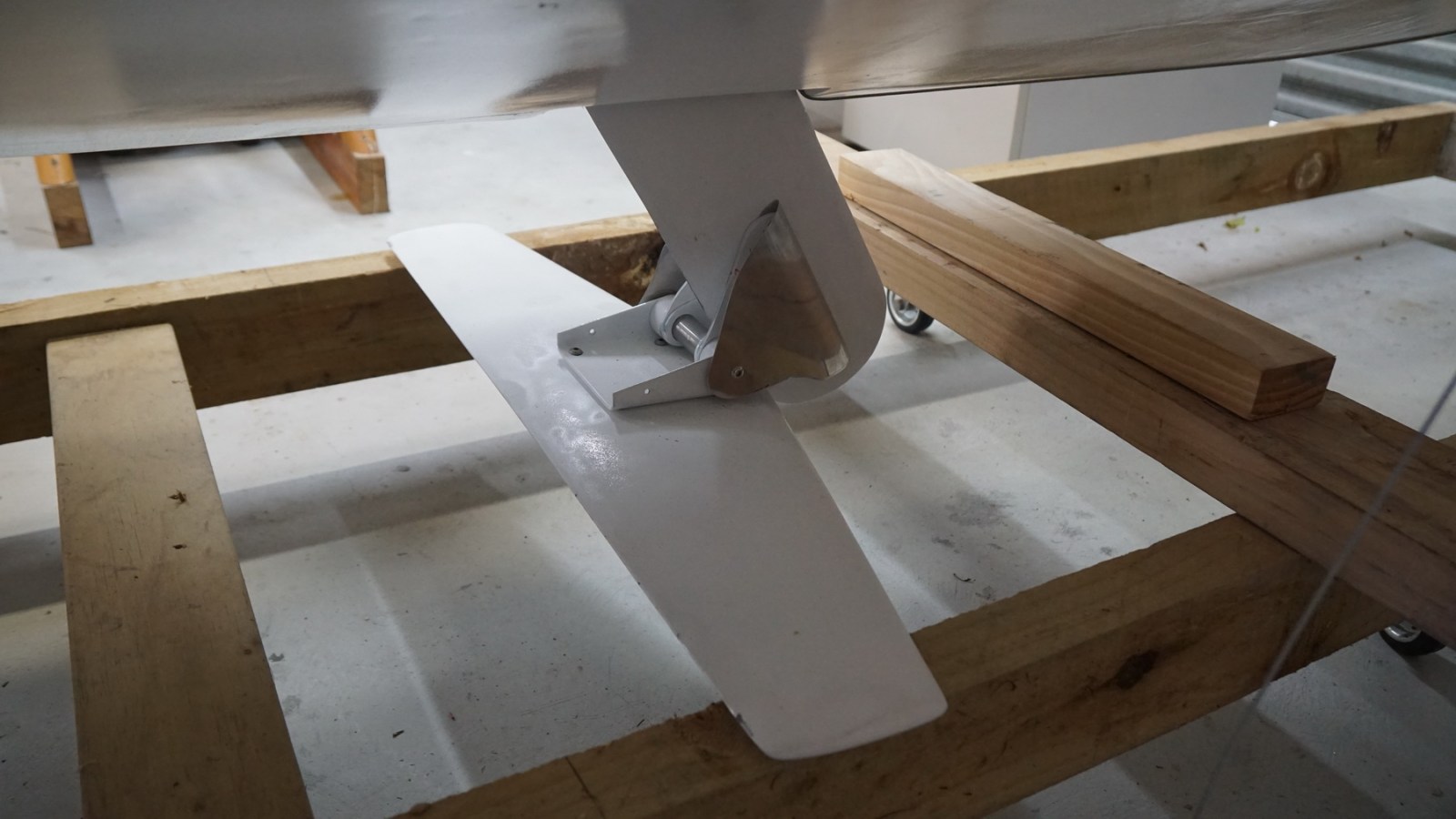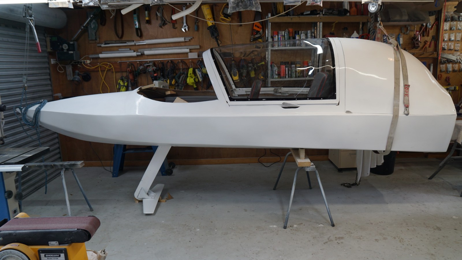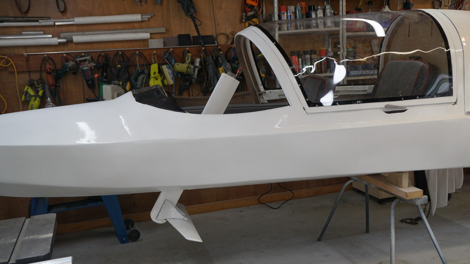 Some colour stripes are to be added over the white basecoat for appearance, and the boat has yet to be seated on a trailer. The boat is currently slung from the overhead garage beams to allow the front fin to be fitted from below. It doesn’t quite clear the canopy to allow for installing from above. Perhaps a design oversight!
