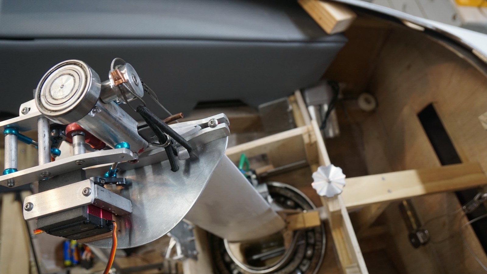 Below is the complicated mechanism to control the pitch of the front fin, via a rod passing down through the vertical fin, using paired R/C servos. These have a rapid response to control inputs and are rated at 35Kg – so should do the trick!