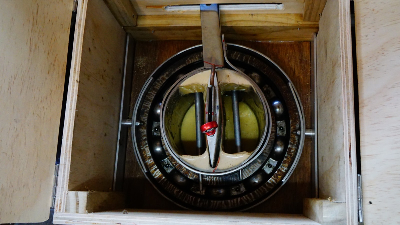 Above- the front foil partially retracted for shallow water operation. Also, the bearing through which the front foil passes. This carries the weight and load of the boat when on the foil. Image three is the dash and seats trial fitted.