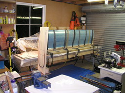 Wing on its jig, ribs bonded, ready for skin to be bonded and vacuumed on. The washout is achieved by twisting the jig in the correct direction!!)