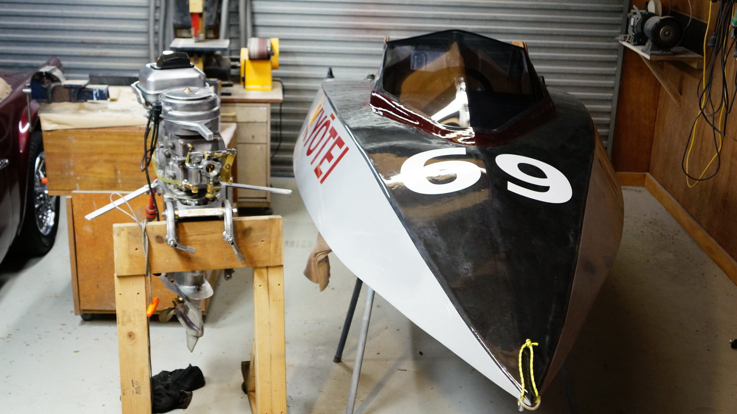 This is a Sorenson design Class C runabout – an Amercian class of family racing single seat boats. Fitted with a 32 HP Yamato racing motor from Japan it is capable of more than 60mph with a lot of fine tuning. I have had it to around 54 mph – a blindingly exhilarating speed. You want goggles to keep the tears out of your eyes, and a flat water day if you want to remain in the boat.